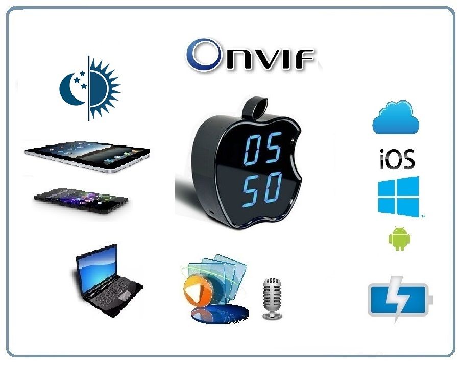 Видеоняня/охранная видеокамера DE-WWI-A720_v2 с интерфейсом работы по WiFi каналу. Уникальное исполнение в виде электронных настольных часов (Apple). Возможность записи на micro SD карту аудио и видео (карта памяти в комплект не входит). Встроенный аккумулятор позволяет автономно работать устройству до 2 часов в штатном режиме при отсутствии питания в сети 220 В. Просмотр и управление с мобильных устройств на базе ОС Android/IOS. Устройство имеет свою WiFi сеть. Вы сможете подключиться к устройству напрямую и работать с ним. После интеграции в Вашу локальную WiFi сеть, будет доступен сервис P2P (Возможность просмотра с любой точки земли через интернет не имея выделенного IP). Ночное видение. Встроенный микрофон и динамик. Просмотр через ВЭБ клиент + софт для ПК. Интеграция с сетевыми IP видеорегистраторами по протоколу ONVIF.
