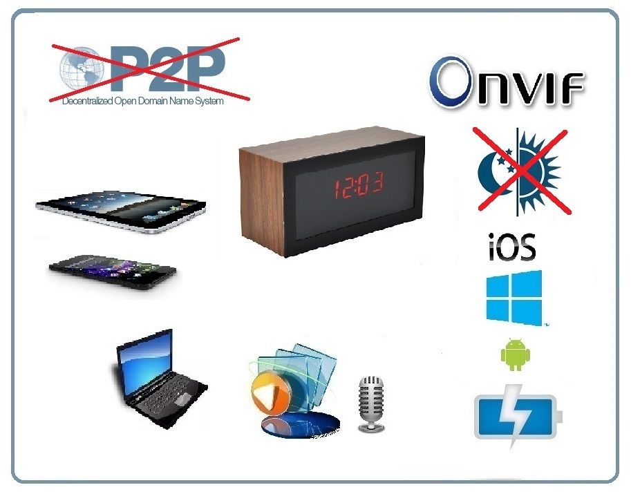 Видеоняня с углом обзора 170 градусов HD 720p и интерфейсом работы по WiFi каналу. Уникальное исполнение в виде электронных настольных часов (информатор времени, месяц и число, температура). Встроенный аккумулятор позволяет работать видеоняне 1 час без питания в сети 220 В. Возможность записи на micro SD карту аудио и видео (карта памяти в комплект не входит). Протокол Onvif. Просмотр и управление с планшетов/ПК/ноутбуков на базе ОС Android/IOS. Устройство имеет свою WiFi сеть. Вы сможете подключиться к устройству напрямую и работать с ним. После интеграции в Вашу локальную WiFi сеть, будет доступен сервис P2P (Возможность просмотра с любой точки земли через интернет не имея выделенного IP). Питание часов осуществляется от трёх пальчиковых батарей типа АА.