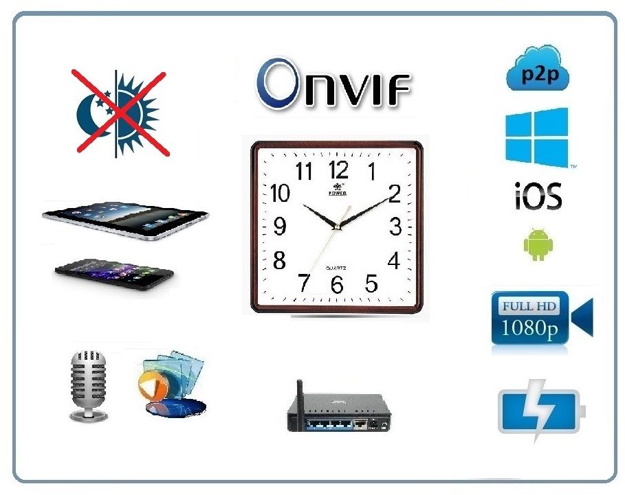Видеоняня - настенные часы с функцией передачи видео и аудио по сети WiFi и проводному соединению LAN. Устройство имеет свою WiFi сеть, а это значит, что Вы сможете подключиться к устройству напрямую и работать с ним. Запись на карту памяти (до 32 Гб.), После интеграции в локальную сеть будет доступен Сервис P2P (просмотр с мобильного из любой точки мира по сети интернет), Питание модуля беспроводной телекамеры осуществляется от встроенного аккумулятора ёмкостью 2000 мА/ч, что позволяет вести беспрерывную работу в течение 2 часов. Предусмотрено подключение питания по USB кабелю. Есть кнопка включения камеры. При этом, питание часов производится от своих источников (батарей). Никак не влияет на работу WiFi/LAN IP видеоняни. Регулировка записи настраивается в ПО, может быть по детектору движения, по расписанию, или вручную. С помощью ПО, Вы можете производить запись непосредственно на сам смартфон, просматривать запись с микро СД карты самой IP видеоняни. делать снимки.