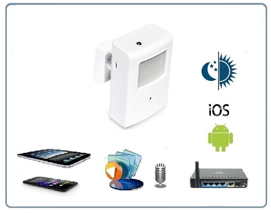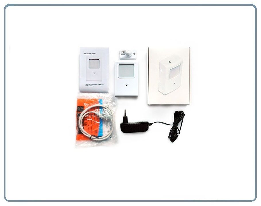 WiFi - LAN IP видеокамера с разрешением 1 Мп, 720p. Выполнена в виде инфракрасного охранного детектора движения. Удобный кронштейн позволит расположить устройство на стене/потолке. Угол обзора 74 градуса. Ночное видение включается автоматически в тёмное время суток. Встроенный микрофон и видеорегистратор, поддерживается карта памяти до 64 Гб. Доступ к просмотру через мобильное приложение с ОС Андроид/IOS. Сервис p2p позволит смотреть WiFi видеокамеру через сеть интернет по всему миру.