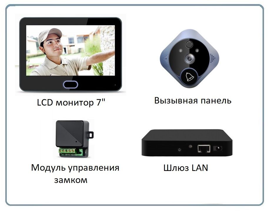 Автономная надверная панель вызова с качеством картинки HD 720P, 1.2 Mp и монитор LCD с диагональю экрана 7" работает по собственной приватной беспроводной связи с шлюзом по частоте 2,4 Ггц на расстоянии до 200 м по прямой видимости.