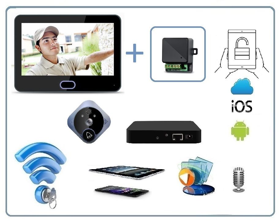 Автономный беспроводной надверный комплект (монитор 7" + панель вызова) с шлюзом LAN с DVR + модуль управления электронным замком, HD (Acebell)