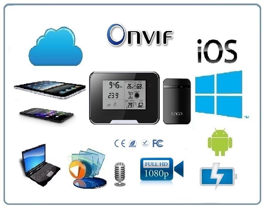 IP видеоняня WiFi (Настольные часы - метеостанция с внешним датчиком температуры, охранная видеокамера) с аккумулятором и с DVR, Full HD 1 Mp