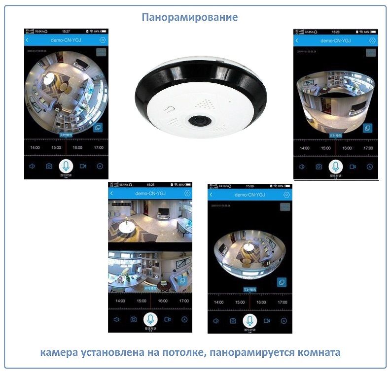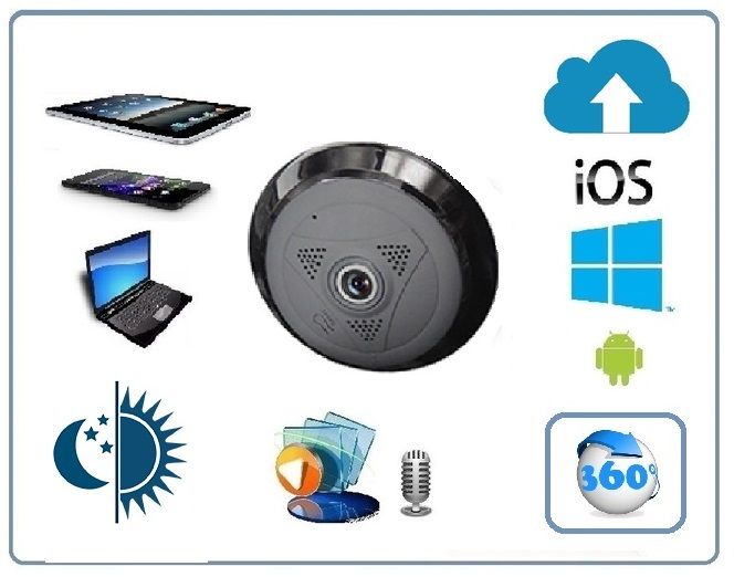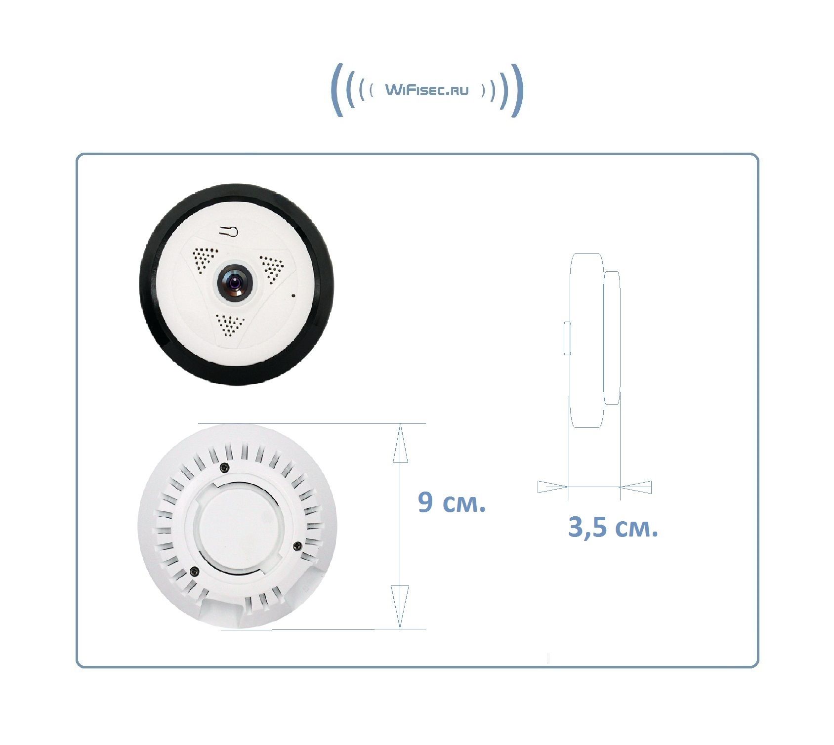 WiFi видеоняня/видеокамера с уникальной технологией объектива Рыбий глаз. Угол обзора такого объектива составляет 360 градусов. Эту модель можно расположить на потолке или полу (полке), на стене. Видит всё в зоне плоскости установки 360 градусов вокруг.
