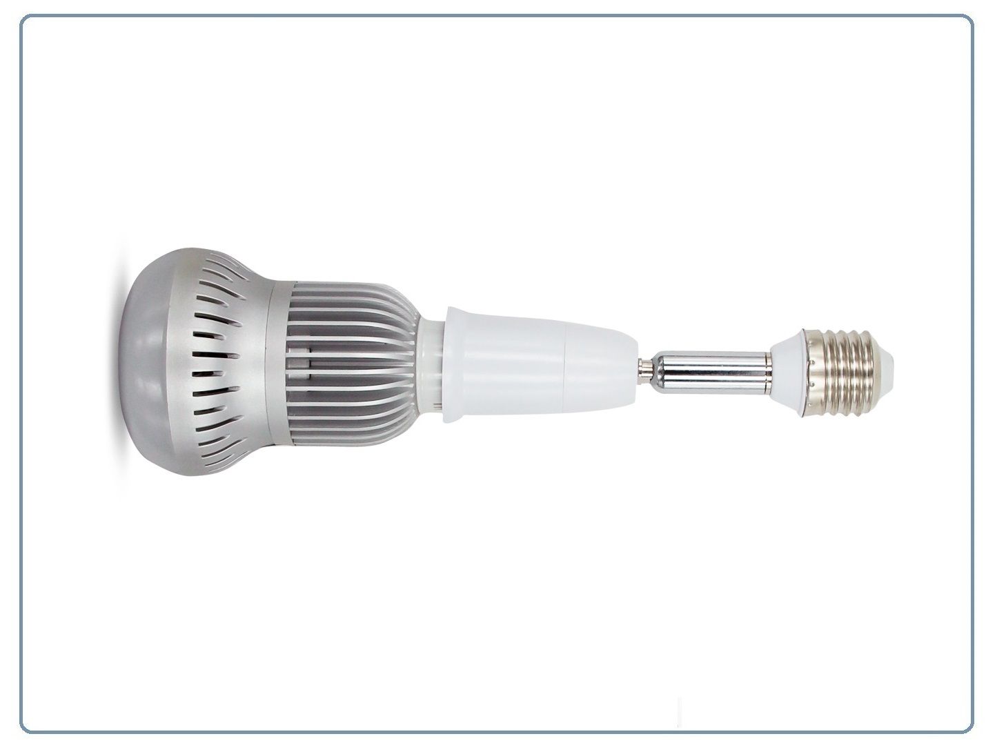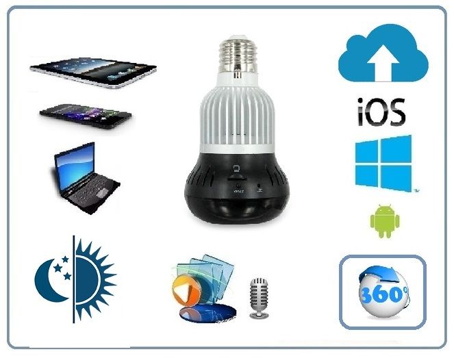 WiFi видеоняня, она же IP видеокамера в виде лампы накаливания. Вкручивается в цоколь Е27. Для удобства, в комплекте идёт адаптер (гибкий удлинитель), он позволяет направить IP видеокамеру в место обзора. Угол обзора у этой модели WiFi видеокамеры 360 градусов. Вы видите всю площадь обзора без искажений. Мобильное приложение позволяет смотреть сцену обзора в 5 - ти разных шаблонах.