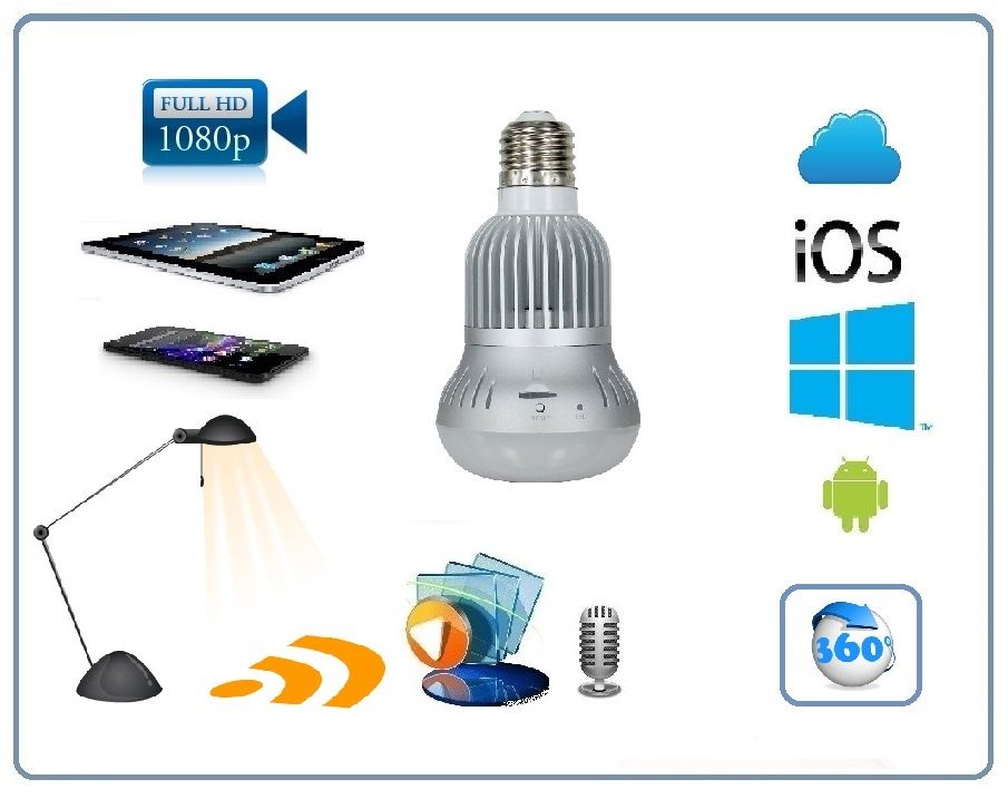 WiFi видеоняня, она же IP видеокамера в виде лампы накаливания. Вкручивается в цоколь Е27. Для удобства, в комплекте идёт адаптер (гибкий удлинитель), он позволяет направить IP видеокамеру в место обзора. Угол обзора у этой модели WiFi видеокамеры 360 градусов. Вы видите всю площадь обзора без искажений. Мобильное приложение позволяет смотреть сцену обзора в 5 - ти разных шаблонах. Встроенный микрофон и динамик в камеру, позволяет вести интерком связь с местом обзора с Вашего мобильного приложения. В устройство встроен видеорегистратор, запись ведётся на микро СД карту памяти объёмом до 128 Гб.