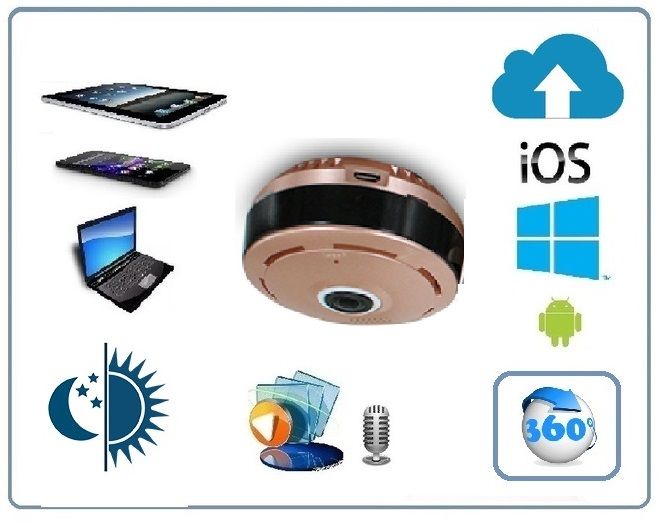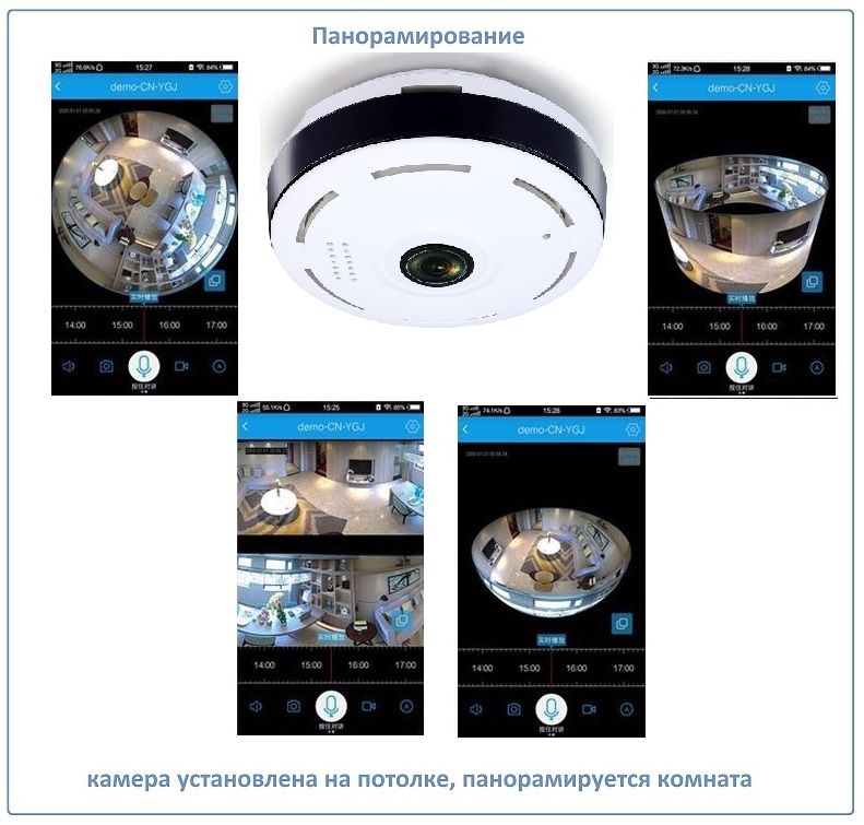 WiFi видеоняня/видеокамера с уникальной технологией объектива Рыбий глаз. Угол обзора такого объектива составляет 360 градусов. Эту модель можно расположить на потолке или полу (полке), на стене. Видит всё в зоне плоскости установки 360 градусов вокруг.