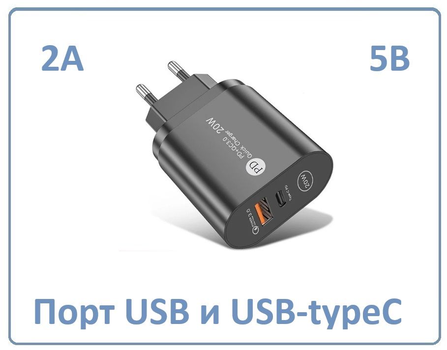 PD+QC3.0 Quick charger 20W Блок питания 2 порта USB-typoC и USB-A, 5V/2А (черный)