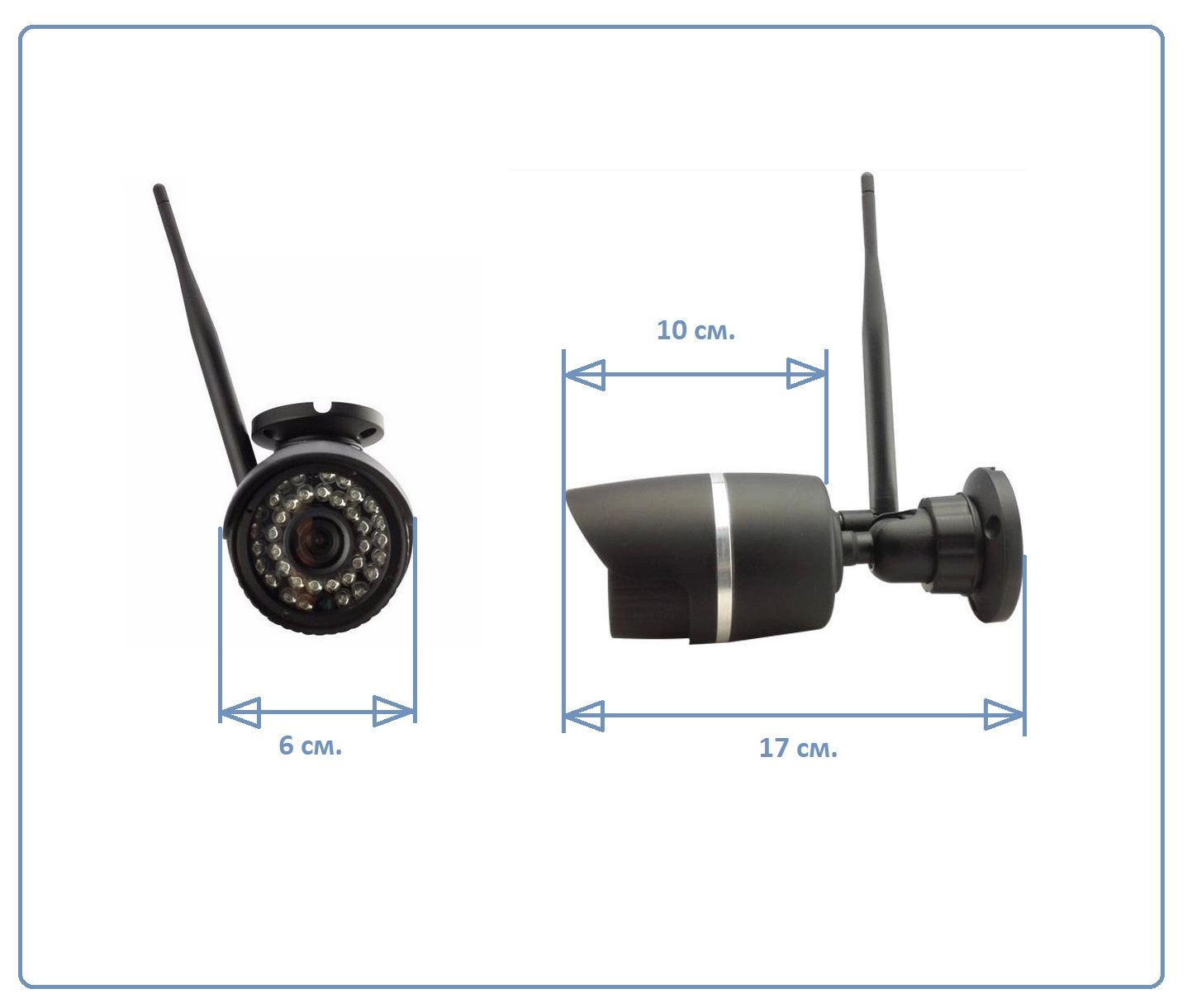 Уличная WiFi (802,11/b/g)/LAN телекамера. Чёрный цвет. FullHD 1080p. 2MP. Объектив 3,6 мм. (угол обзора 74 град.). Температурный диапазон работы - 30 до + 60. Дальность ночной подсветки 30 метров. Отлично работает по проводному соединению RJ45 (необходимо для первоначальной настройки) так и по WiFi связи. Onvif 2.0 доступна для записи на IP видеорегистраторы. Сервис P2P (доступна для просмотра из любой точки мира посредством интернет связи) на мобильных устройствах и на ПК с ОС W. Дальность связи по прямой видимости 100 - 150 м. (антенна с коэффициентом усиления 7Дб). Приложение для IOS и Android и Виндоуз. Встроенный видеорегистратор (карта 64 Гб вставлена). Питание 12VDC, 2 А. Не комплектуется блоком питания (смотрите раздел аксессуары).