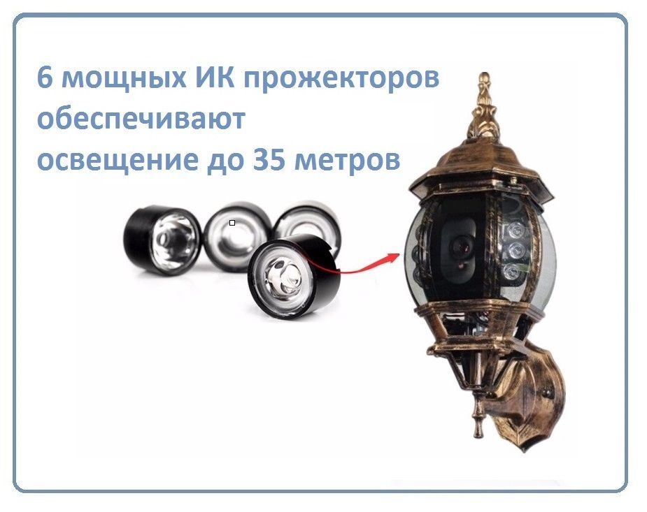 Уличная WiFi/LAN охранная видеокамера с разрешением 1080р (FullHD). 2Mp. Выполнена в корпусе декоративного светильника под старину. Изделие работает как IP WiFi/LAN видеокамера и как светильник. Включение светильника происходит от встроенного датчика освещения в ночное время. В этой модели есть ночное видение, площадка в 35 метров хорошо освещается мощными ИК светодиодами. Дальность связи с роутером по прямой видимости - до 100 метров. Тепературный режим работы изделия от -20 до + 60 град. С. Сервис p2p позволяет использовать просмотр изделия на мобильных устройствах через сеть интернет из любой точки планеты. Протокол ONVIF позволяет интегрировать эту модель с IP видеорегистраторами.