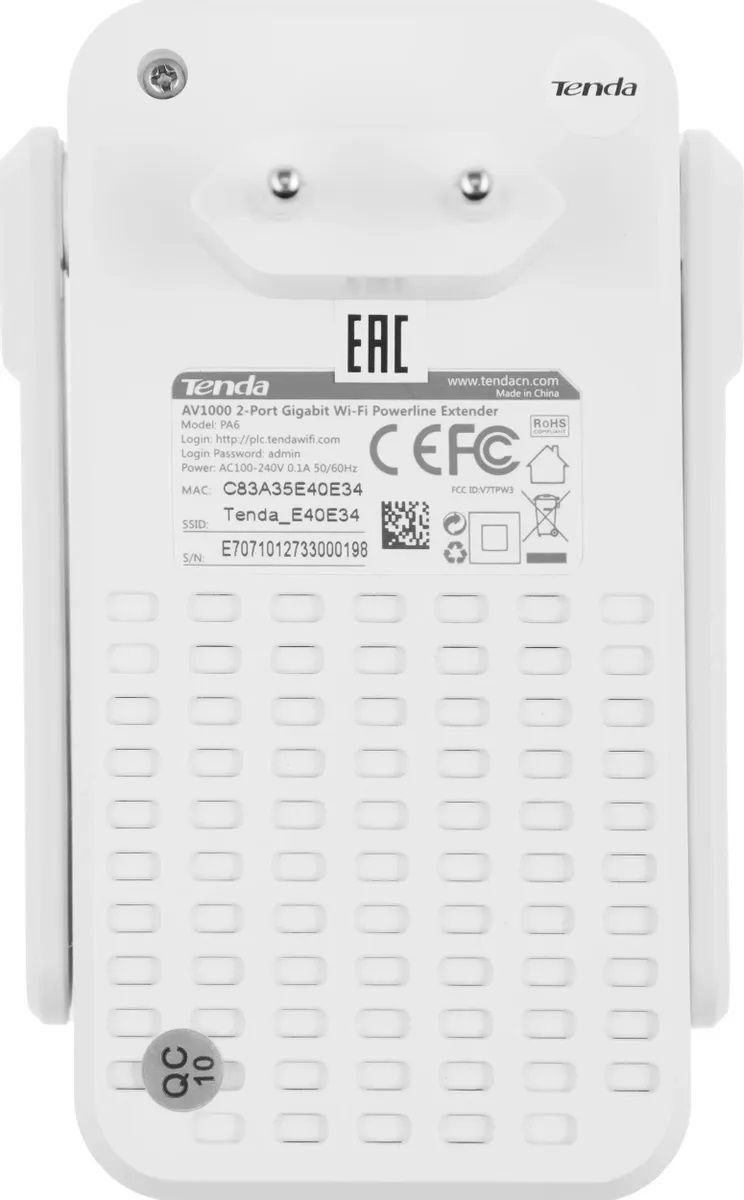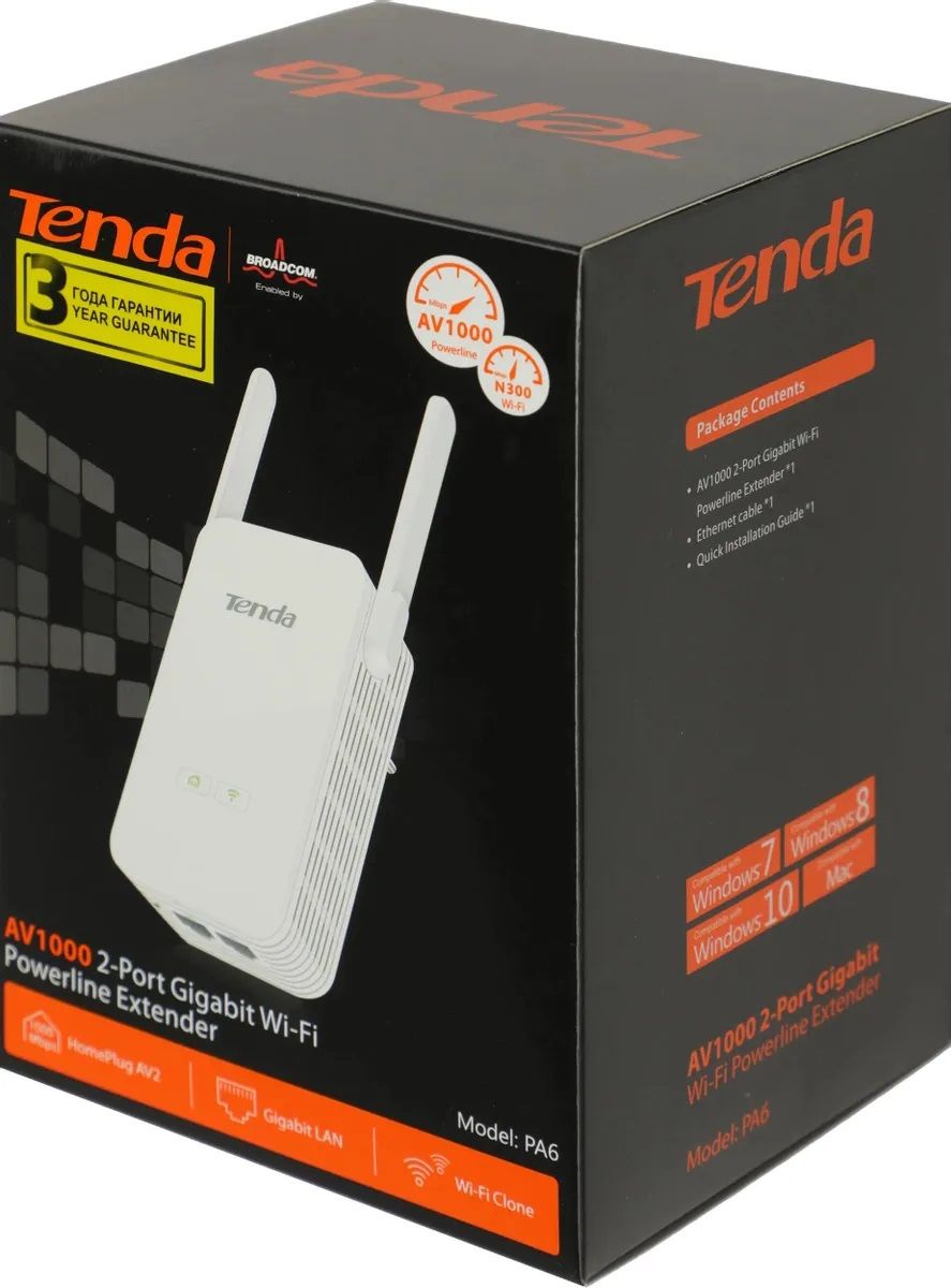 Сетевой адаптер Wi-Fi 2.4ГГц Powerline TENDA PA6 Gigabit Ethernet AV1000 2-портовый повторитель (1 шт.)