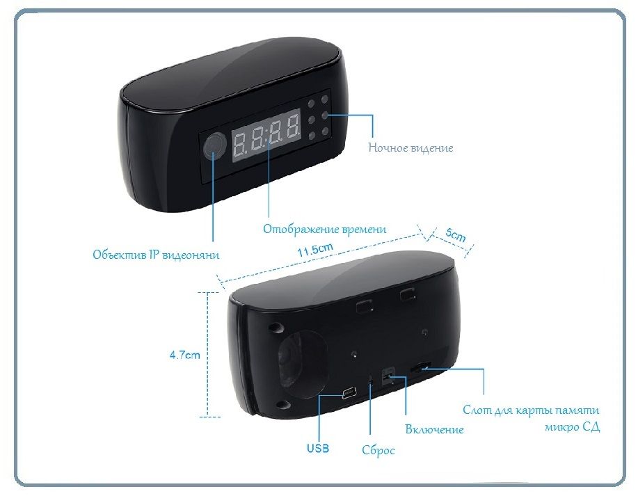 Видеоняня с углом обзора 170 градусов Full HD 1080p и интерфейсом работы по WiFi каналу. Уникальное исполнение в виде электронных настольных часов. Возможность записи на micro SD карту аудио и видео (карта памяти в комплект не входит). Встроенный аккумулятор позволяет автономно работать устройству в течение 2-3 часов. Протокол Onvif 2.0. Просмотр и управление с планшетов/ПК/ноутбуков на базе ОС Android/IOS. Устройство имеет свою WiFi сеть. Вы сможете подключиться к устройству напрямую и работать с ним. После интеграции в Вашу локальную WiFi сеть, будет доступен сервис P2P (Возможность просмотра с любой точки земли через интернет не имея выделенного IP).